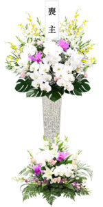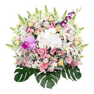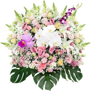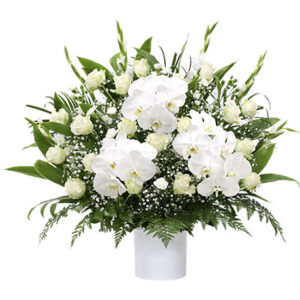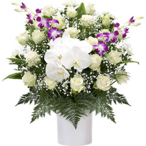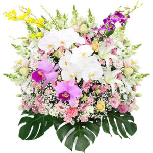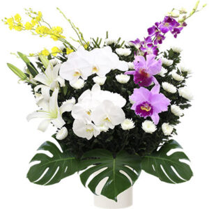 H85cm × W80cm胡蝶蘭・ハイブリッドリリー・バラ・デンファレ・ カーネーション・トルコギキョウ・カスミソウ・モンステラ
