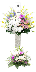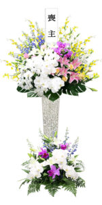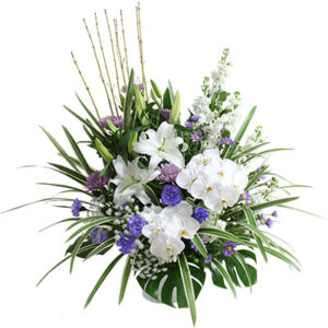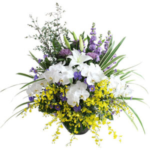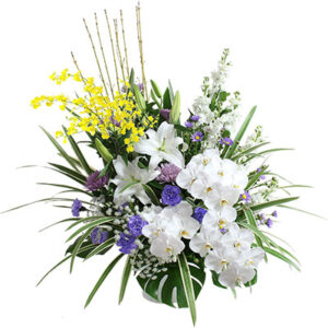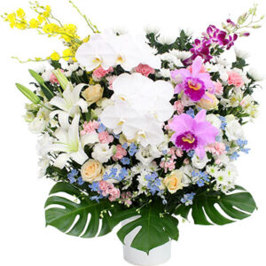 H85cm × W80cm胡蝶蘭・ハイブリッドリリー・カトレア・オンシジューム・デルフィニウム・シラギク・バラ・カーネーション・モンステラ