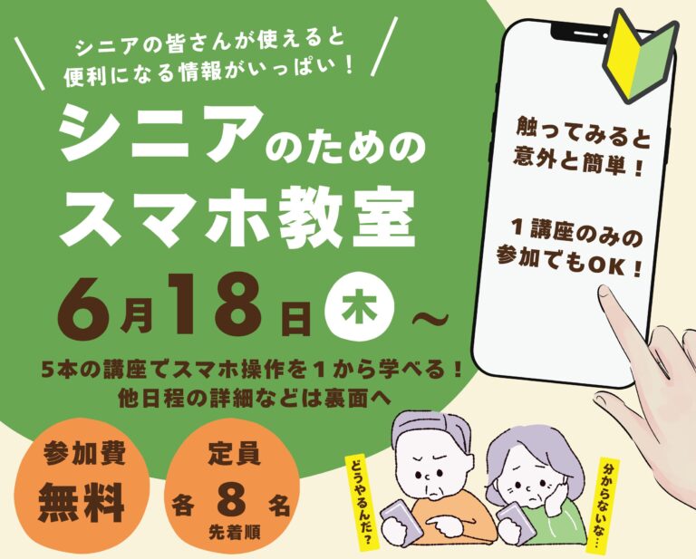 | 6月18日(木) | はじめてのスマホの第一歩 電源の入れ方、電話の機能、カメラの撮影など |
